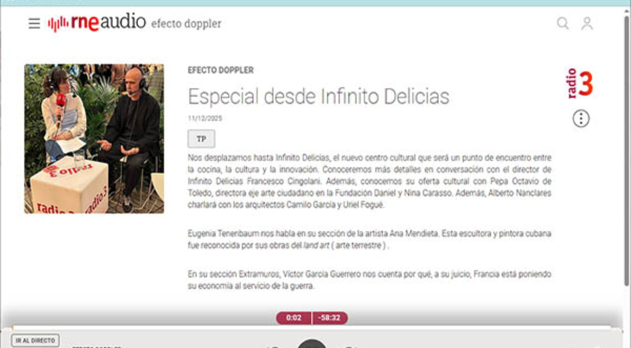 Yesterday, the Doppler Effect program (Radio 3) visited the Infinito Delicias building to learn about the details of the inauguration live. We participated alongside Husos in this interview, where we discussed the architectural details of the project. + info: https://www.rtve.es/play/audios/efecto-doppler/especial-infinito-delicias-11-12-25/16855243/ + + + Ayer el programa Efecto Doppler (Radio 3) se desplazó hasta el edificio de Infinito Delicias para conocer en vivo los detalles de la inauguración. Participamos junto a Husos en esta entrevista donde hablamos de los detalles arquitectónicos de la obra. + info: https://www.rtve.es/play/audios/efecto-doppler/especial-infinito-delicias-11-12-25/16855243/