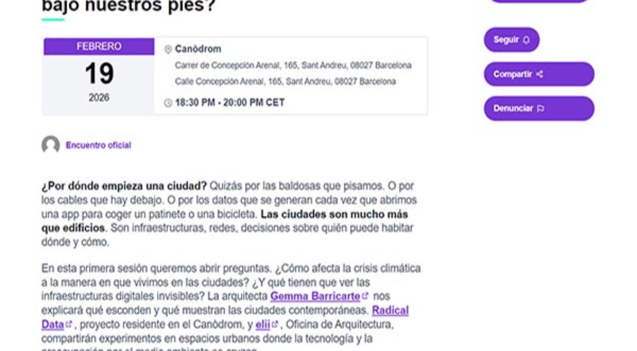 Where does a city begin? Perhaps with the tiles we walk on. Or with the cables underneath. Or with the data generated every time we open an app to get a scooter or a bike. Cities are much more than buildings. They are infrastructures, networks, decisions about who can live where and how. In this first session, we want to raise questions. How does the climate crisis affect the way we live in cities? And what do invisible digital infrastructures have to do with it? Architect Gemma Barricarte will explain what contemporary cities hide and what they reveal. Radical Data, a project based at Canòdrom, and elii [Architecture Office] will share experiments in urban spaces where technology and concern for the environment intersect. Organized by: Canòdrom - Ateneu de Innovación Digital y Democrática. In collaboration with: Aula Ambiental de Sant Andreu. Location: Canódromo, Calle Concepción Arenal, 165, Sant Andreu, 08027 Barcelona Time: 6:30-8:00 p.m. + info: https://comunitat.canodrom.barcelona/conferences/rrreparem-el-futur/f/2711/meetings/3052 + + + ¿Por dónde empieza una ciudad? Quizás por las baldosas que pisamos. O por los cables que hay debajo. O por los datos que se generan cada vez que abrimos una app para coger un patinete o una bicicleta. Las ciudades […]