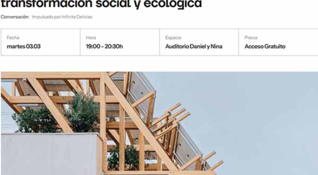 During ARCO Madrid week, Infinito Delicias will host a round table moderated by its director, Javier Martín-Jiménez, in which four architects will discuss the active role of architecture in addressing, resolving, and analyzing social and environmental problems. Participants include Lluis Alexandre Casanovas Blanco, María Auxiliadora Gálvez (PSAAP), Diego Barajas (Husos), and Uriel Fogué (elii). Location: Infinito Delicias, Calle Juana DOña, 5. Madrid. Schedule: 7:00-8:30 p.m. + info: https://www.infinitodelicias.com/es/agenda/arquitecturas-ensayos-transformacion-social-ecologica + + + Durante la semana de ARCO Madrid, Infinito Delicias acoge una mesa moderada por su director, Javier Martín-Jiménez en la que cuatro arquitectos dialogarán sobre el papel activo de la arquitectura para afrontar, resolver y analizar problemas sociales y ambientales. Participan Lluis Alexandre Casanovas Blanco, María Auxiliadora Gálvez (PSAAP), Diego Barajas (Husos) y Uriel Fogué (elii). Lugar: Infinito Delicias, Calle Juana DOña, 5. Madrid. Hora: 19:00-20:30h + info: https://www.infinitodelicias.com/es/agenda/arquitecturas-ensayos-transformacion-social-ecologica