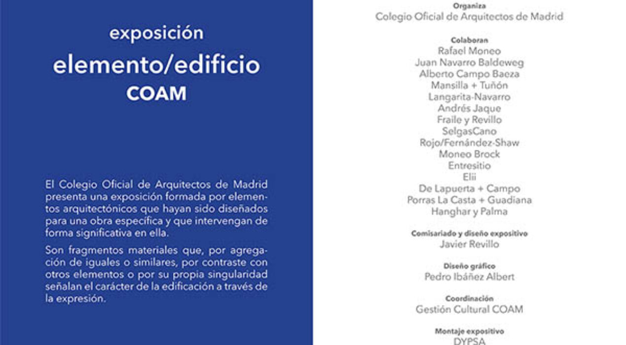 Elii participates in the “Elemento-Edificio” exhibition at the Architect@Work Madrid 2024 fair, curated by Javier Revillo. Organized by: Official College of Architects of Madrid. Collaborators: Rafael Moneo, Juan Navarro Baldeweg, Alberto Campo Baeza, Mansilla + Tuñón, Langarita-Navarro, Andrés Jaque, Fraile y Revillo, SelgasCano, Rojo/Fernández-Shaw, Moneo Brock, Entresitio, Elii [architecture office], De Lapuerta + Campo, Porras La Casta + Guadiana, Hanghar and Palma. Curator and exhibition design: Javier Revillo. Graphic design: Pedro Ibáñez Albert. Coordination: Cultural Management COAM. Exhibition mounting: DYPSA. Date: May 8 and 9, 2024. Venue: Pavilion 4 of IFEMA, Madrid. + info: https://madrid.architectatwork.es/es/exposiciones-y-conferencias/ + + + Elii participa en la exposición "Elemento-Edificio" en la feria Architect@Work Madrid 2024, comisariada por Javier Revillo. Organiza: Colegio Oficial de Arquitectos de Madrid Colaboran: Rafael Moneo, Juan Navarro Baldeweg, Alberto Campo Baeza, Mansilla + Tuñón, Langarita-Navarro, Andrés Jaque, Fraile y Revillo, SelgasCano, Rojo/Fernández-Shaw, Moneo Brock, Entresitio, Elii [oficina de arquitectura], De Lapuerta + Campo, Porras La Casta + Guadiana, Hanghar y Palma. Comisariado y diseño expositivo: Javier Revillo. Diseño gráfico: Pedro Ibáñez Albert. Coordinación: Gestión Cultural COAM. Montaje expositivo: DYPSA. Fecha: 8 y 9 de mayo de 2024. Lugar: Pabellón 4 de IFEMA, Madrid. "El Colegio Oficial de Arquitectos de Madrid presenta una exposición formada por elementos arquitectónicos que hayan sido diseñados para una obra específica y que intervengan de forma significativa […]