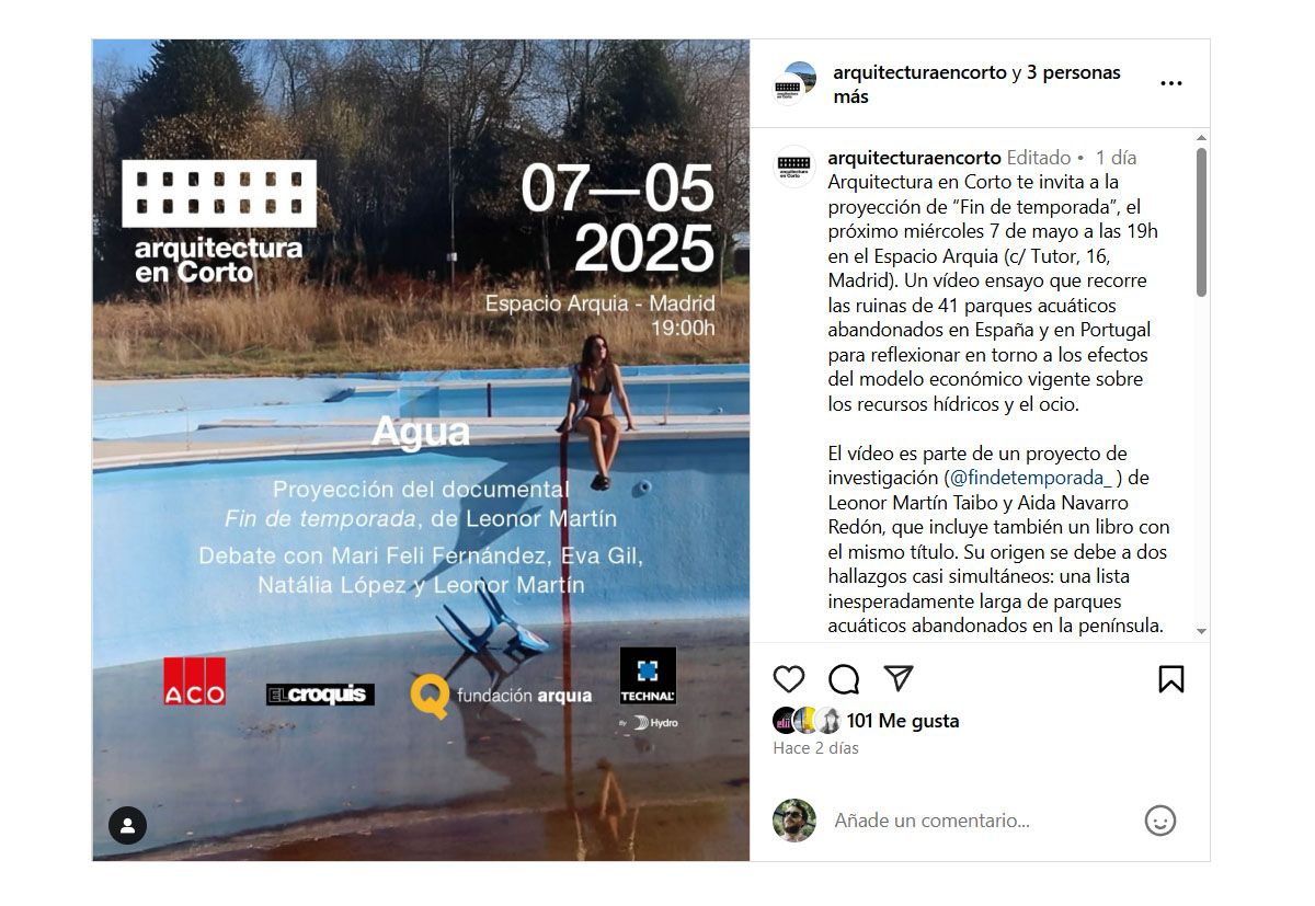 Eva Gil participates in Arquitectura en Corto. Arquitectura en Corto invites you to the screening of “Fin de temporada”, next Wednesday May 7 at 7 pm at Espacio Arquia (c/ Tutor, 16, Madrid). A video essay that travels through the ruins of 41 abandoned water parks in Spain and Portugal to reflect on the effects of the current economic model on water resources and leisure.