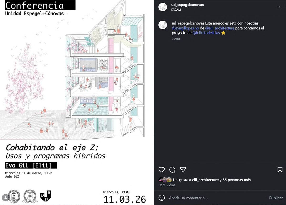 On Wednesday, March 11, Eva Gil will give a lecture entitled “Cohabiting the Z Axis: Hybrid Uses and Programs” at the Espegel Cánovas Unit.