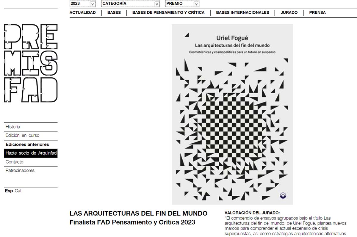 'Las arquitecturas del fin del mundo' is a finalist in the FAD Thought and Criticism Awards 2023. The winner will be announced in October. Thanks to the jury and Puente editores and congratulations to the rest of the finalists. Fingers crossed!!!