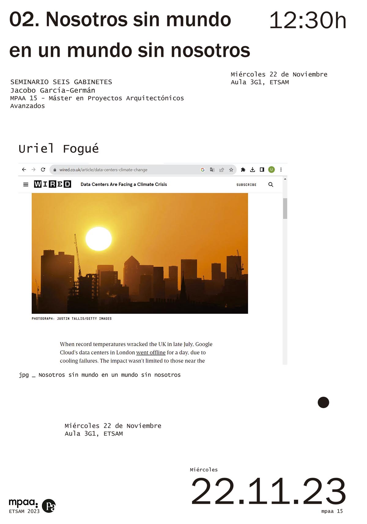 First class of the course "The architectures of the end of the world" entitled "Us without a world in a world without us". Taught by Uriel Fogué. Wednesday, November 15, 2023, from 12:30-14:30, ETSAM.