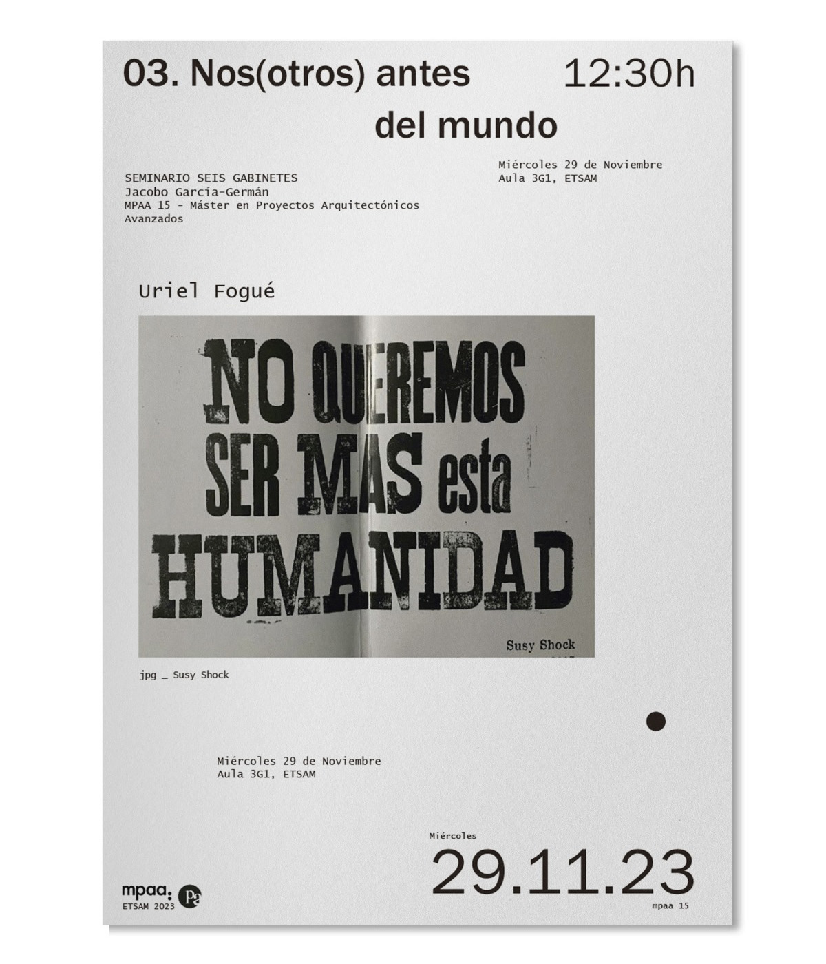 Third class of the course "The architectures of the end of the world" entitled "Us before the world". Taught by Uriel Fogué. Wednesday, November 29, 2023, from 12:30-14:30, ETSAM.