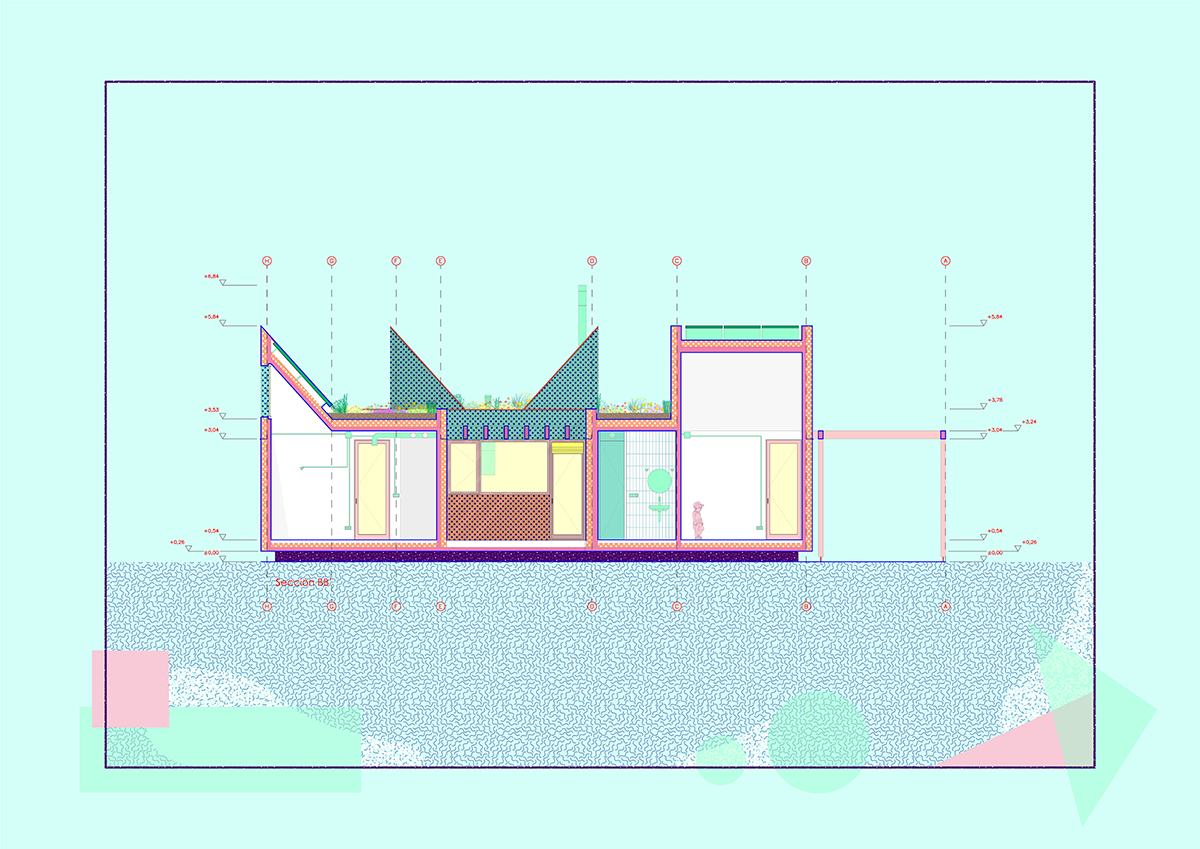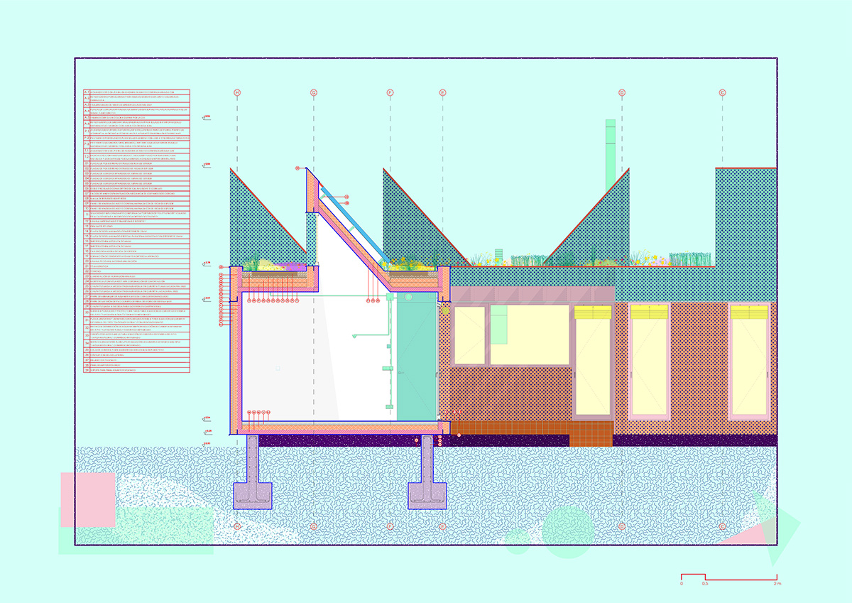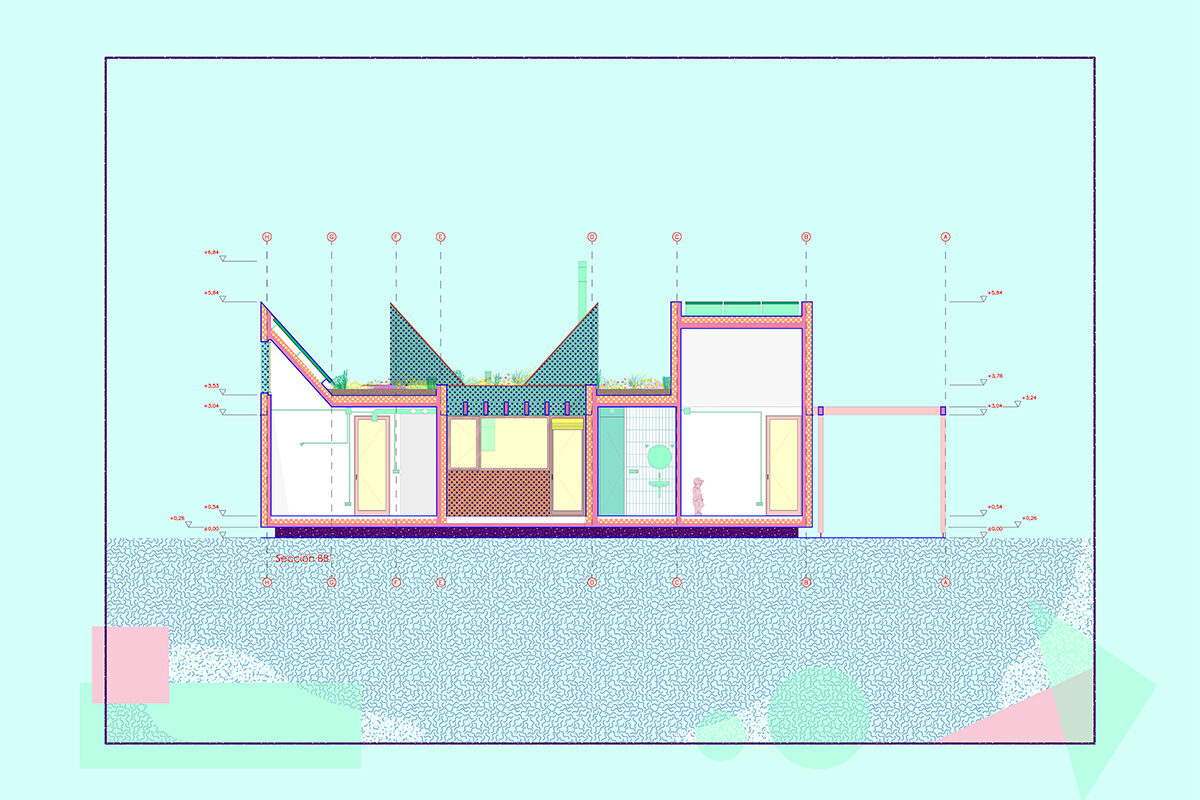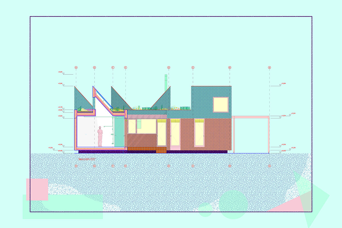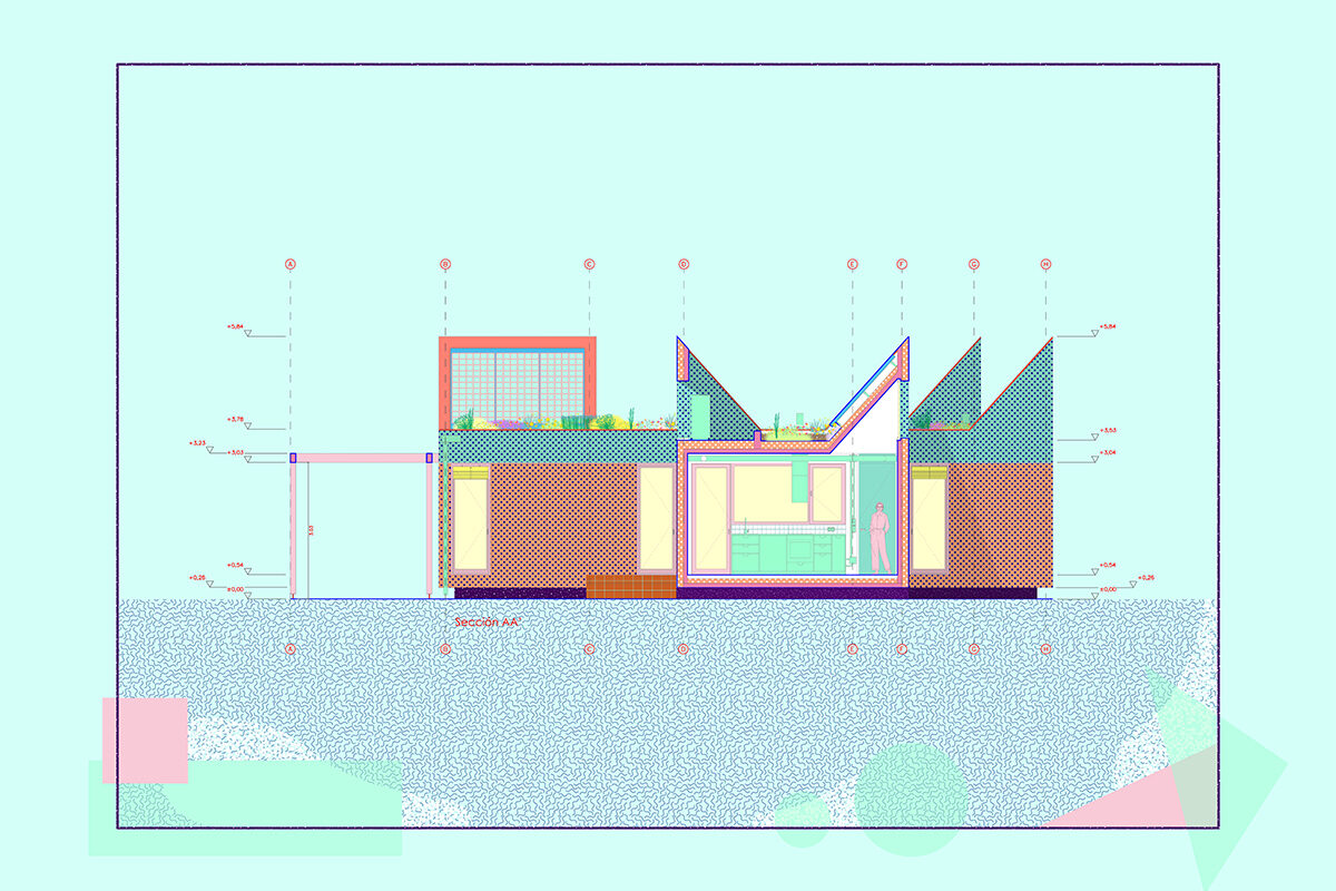 The design is organised around two main strategies. On one hand, in plan view, the project is laid out in modules, following a flexible functional arrangement that can accommodate both domestic spaces and remote work. On the other hand, in section view, it is configured from two overlaying bodies that offer different ways of engaging with the surroundings and the environment. The lower strip addresses needs for basic natural lighting, views, entryways, and ventilation. Through a system of openings and solid-surface panels, this strip provides a direct relationship with the indoor and outdoor spaces to interact with the inhabitants’ bodies. The upper strip focuses on capturing light from above, generating energy, and supporting a green roof.