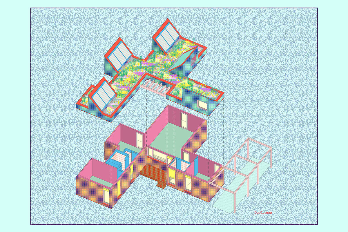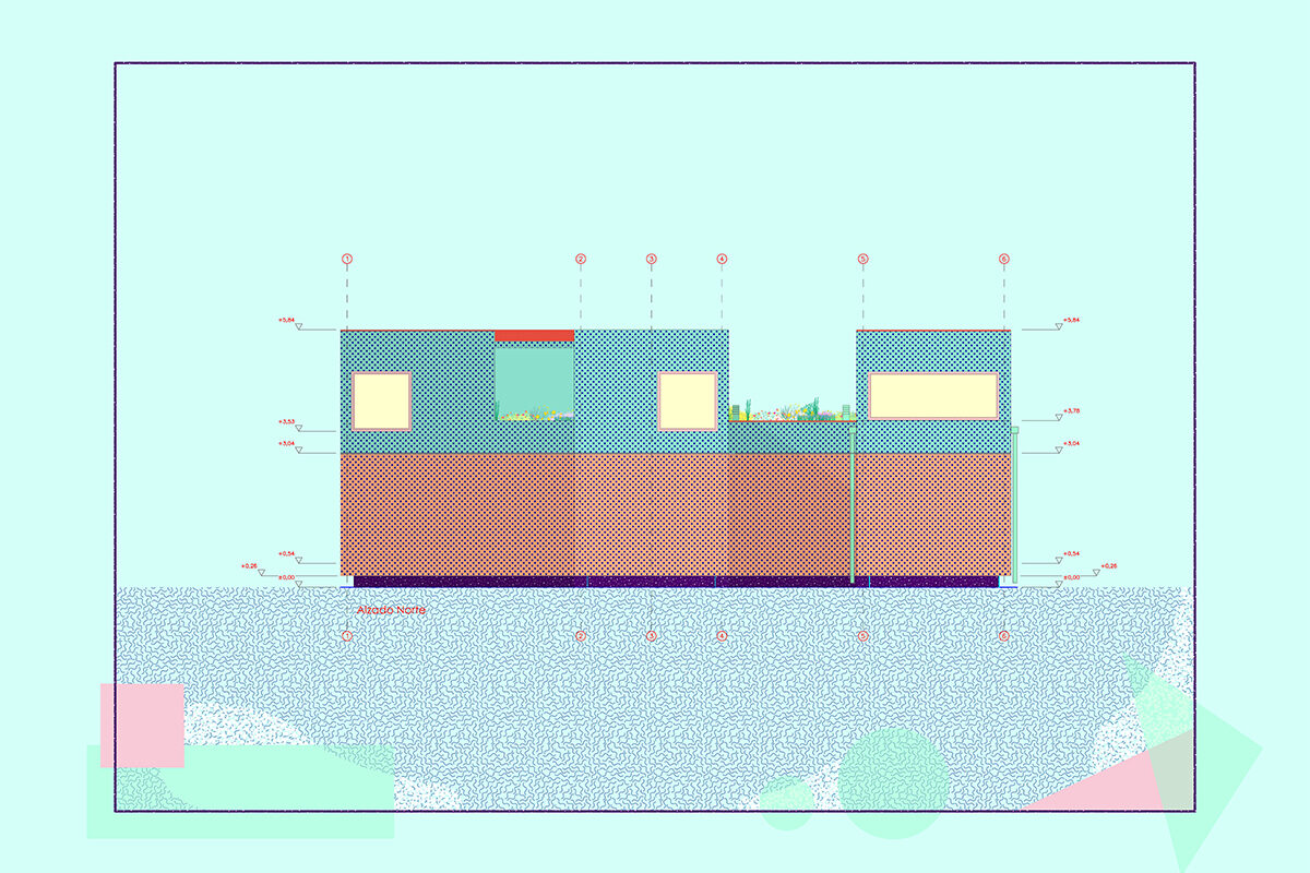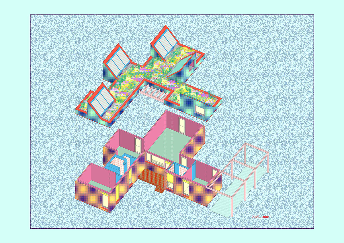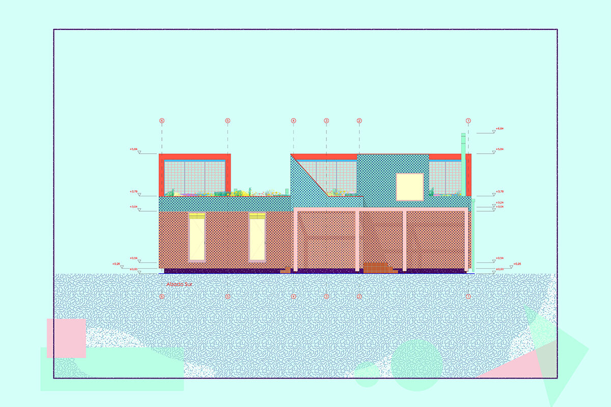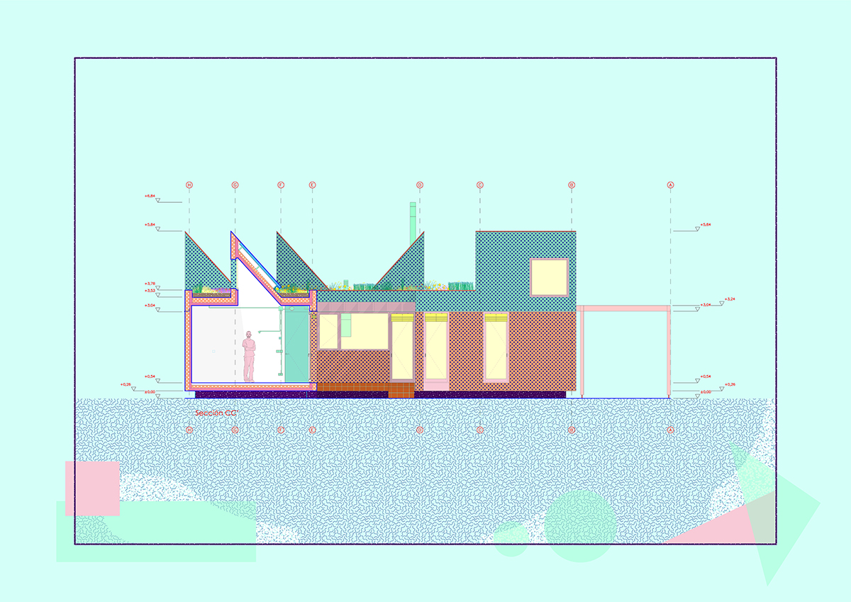 The design is organised around two main strategies. On one hand, in plan view, the project is laid out in modules, following a flexible functional arrangement that can accommodate both domestic spaces and remote work. On the other hand, in section view, it is configured from two overlaying bodies that offer different ways of engaging with the surroundings and the environment. The lower strip addresses needs for basic natural lighting, views, entryways, and ventilation. Through a system of openings and solid-surface panels, this strip provides a direct relationship with the indoor and outdoor spaces to interact with the inhabitants’ bodies. The upper strip focuses on capturing light from above, generating energy, and supporting a green roof.