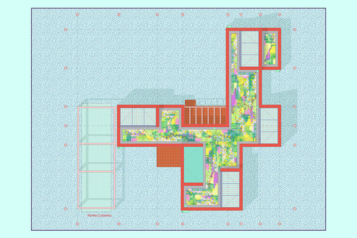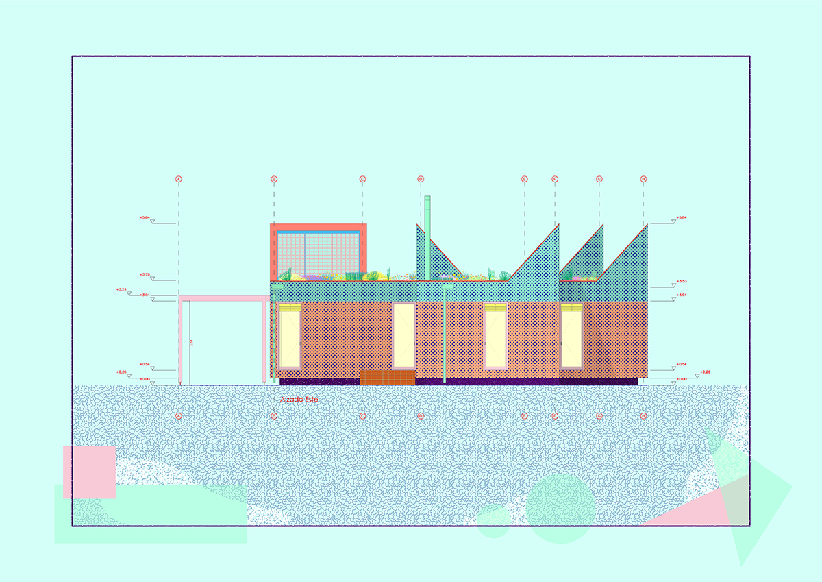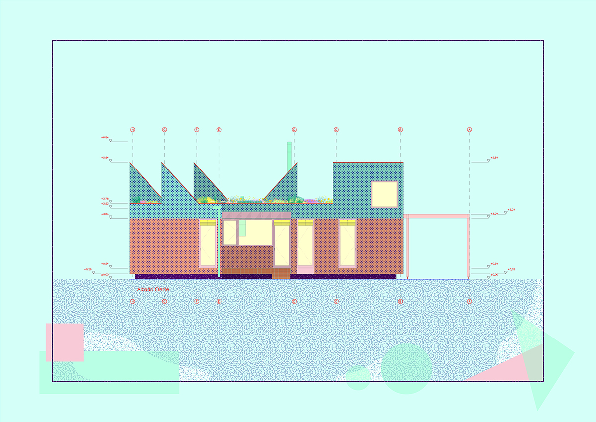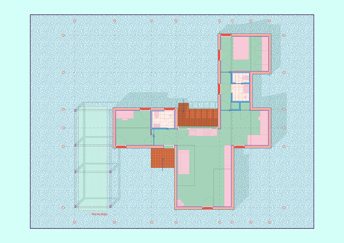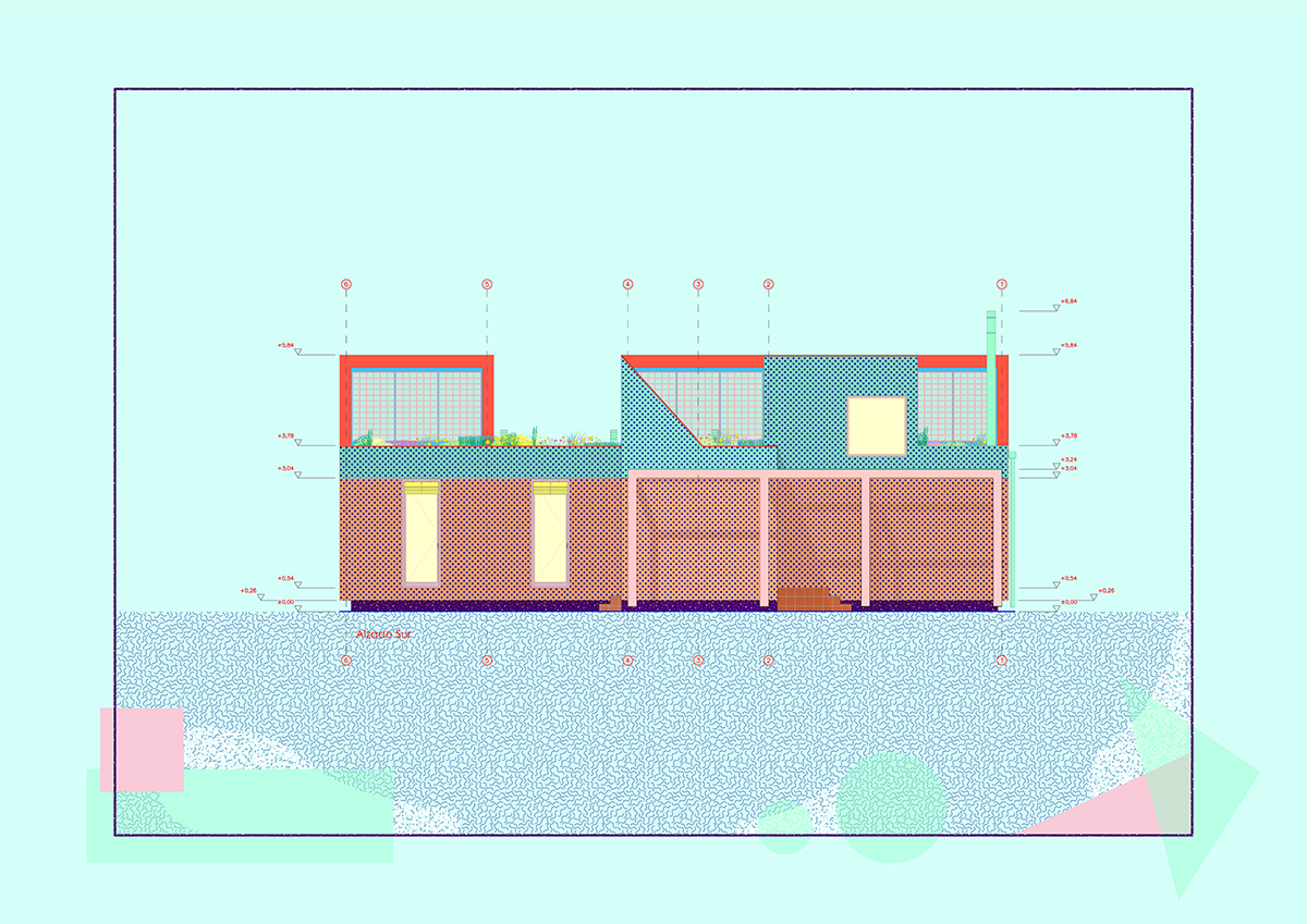 The design is organised around two main strategies. On one hand, in plan view, the project is laid out in modules, following a flexible functional arrangement that can accommodate both domestic spaces and remote work. On the other hand, in section view, it is configured from two overlaying bodies that offer different ways of engaging with the surroundings and the environment. The lower strip addresses needs for basic natural lighting, views, entryways, and ventilation. Through a system of openings and solid-surface panels, this strip provides a direct relationship with the indoor and outdoor spaces to interact with the inhabitants’ bodies. The upper strip focuses on capturing light from above, generating energy, and supporting a green roof.