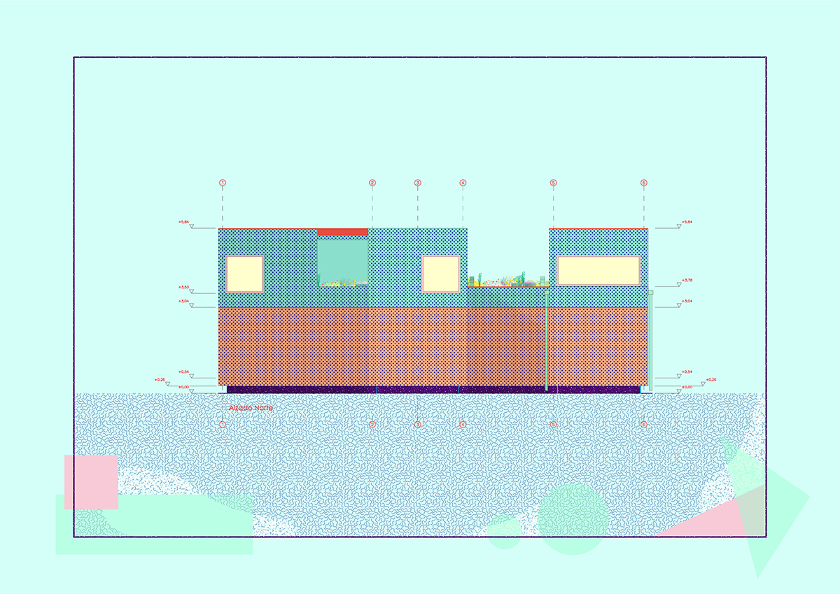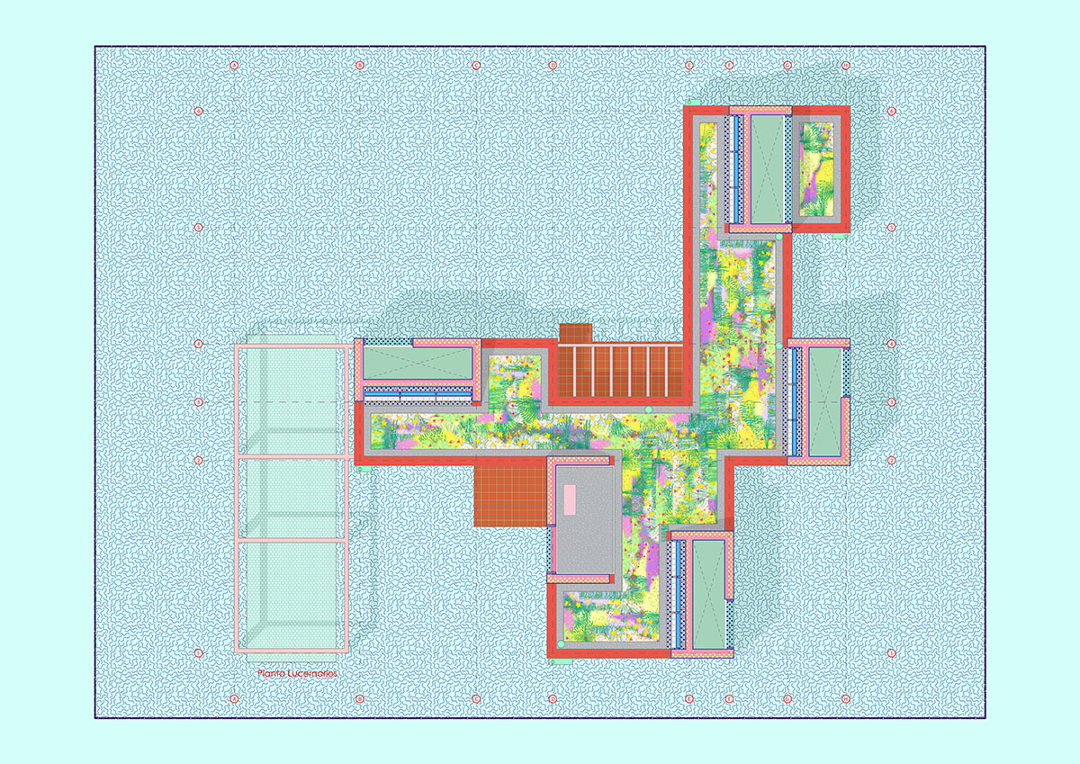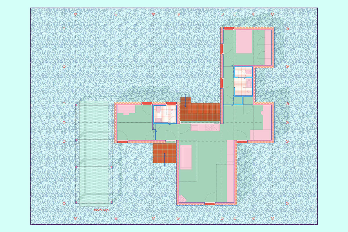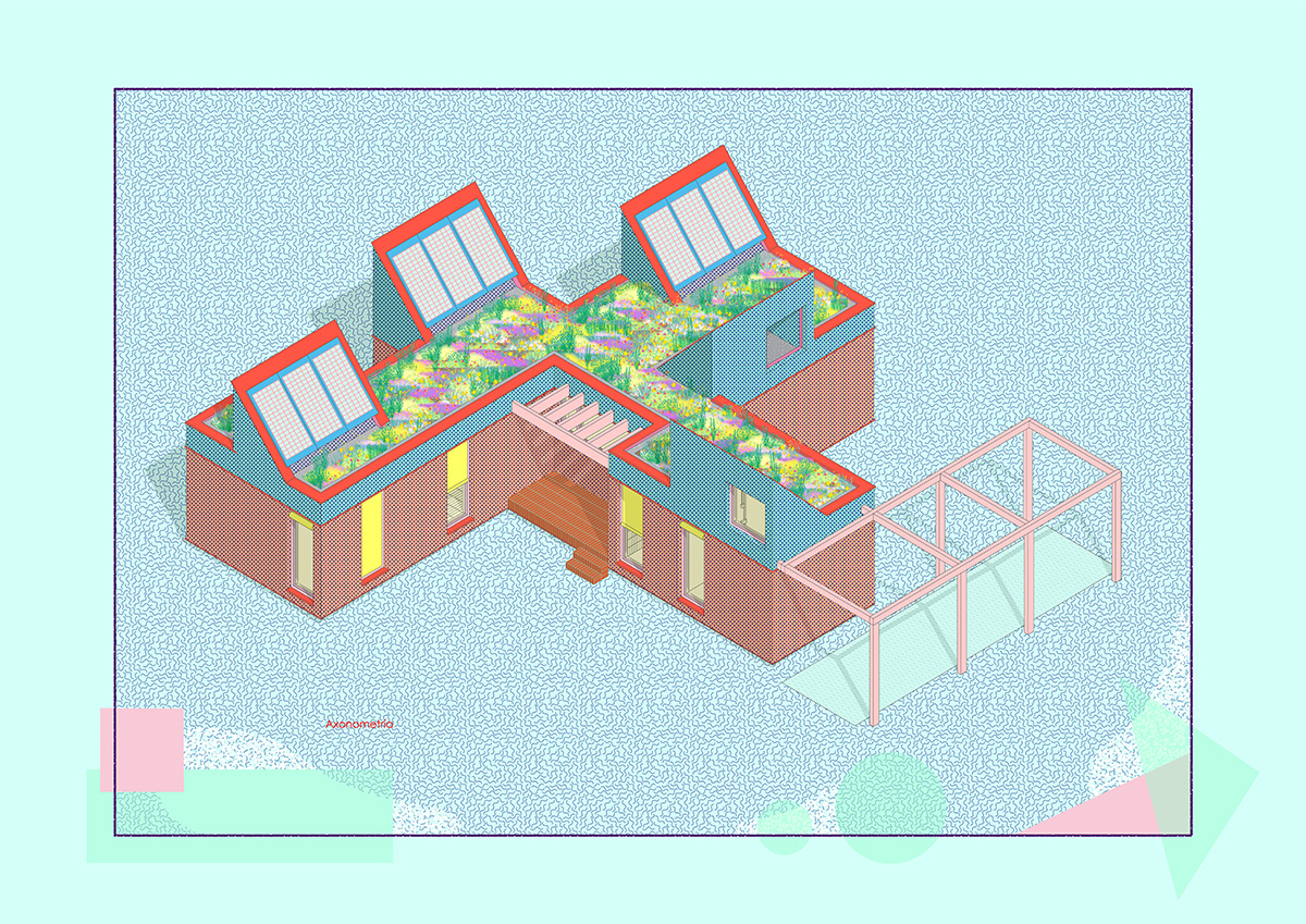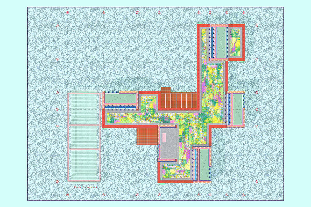 The design is organised around two main strategies. On one hand, in plan view, the project is laid out in modules, following a flexible functional arrangement that can accommodate both domestic spaces and remote work. On the other hand, in section view, it is configured from two overlaying bodies that offer different ways of engaging with the surroundings and the environment. The lower strip addresses needs for basic natural lighting, views, entryways, and ventilation. Through a system of openings and solid-surface panels, this strip provides a direct relationship with the indoor and outdoor spaces to interact with the inhabitants’ bodies. The upper strip focuses on capturing light from above, generating energy, and supporting a green roof.