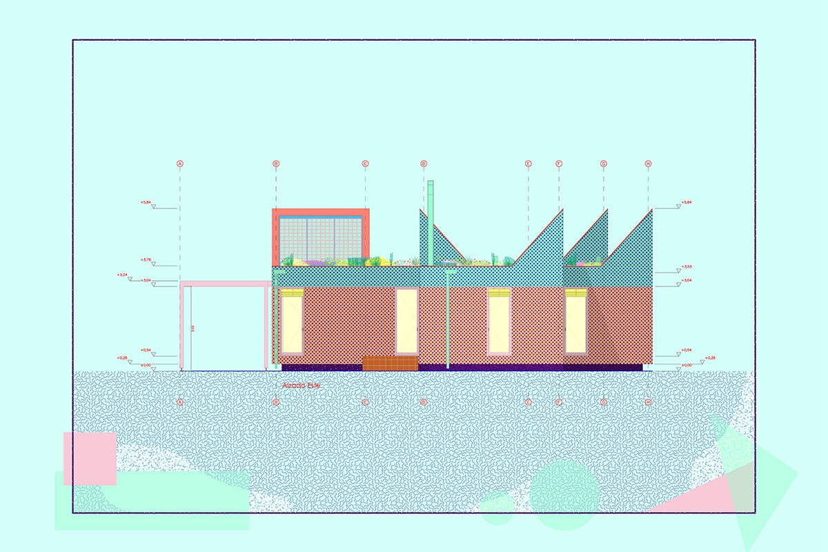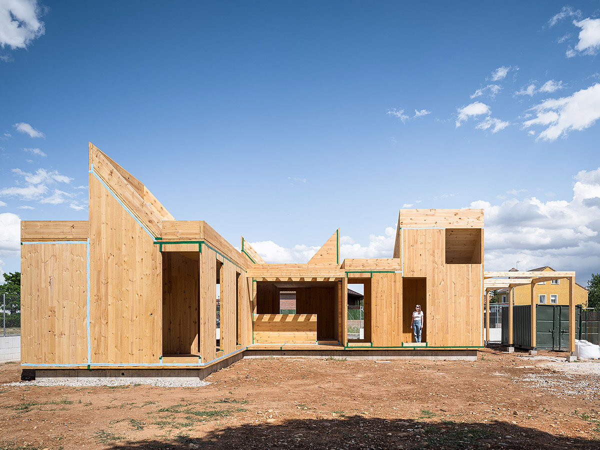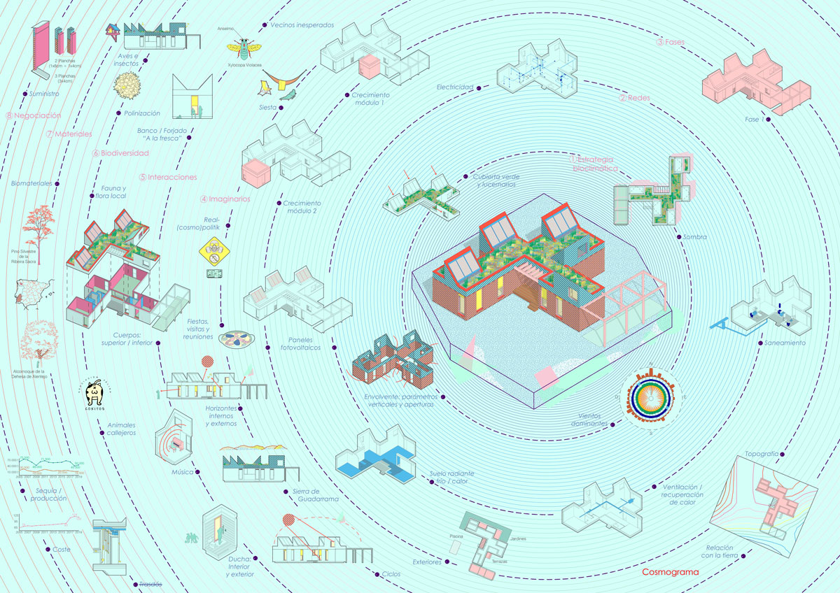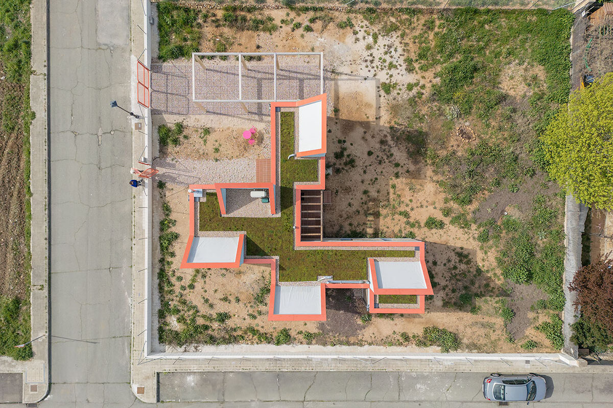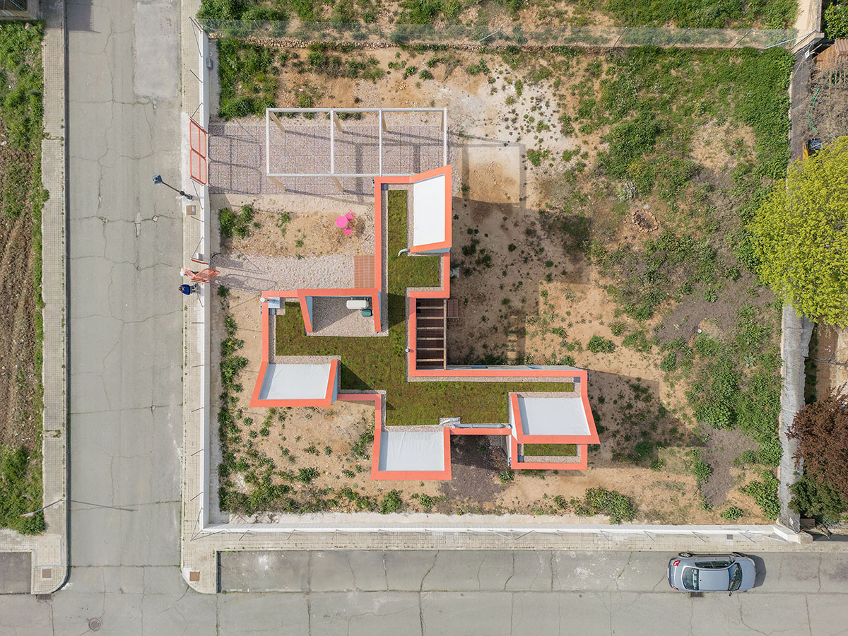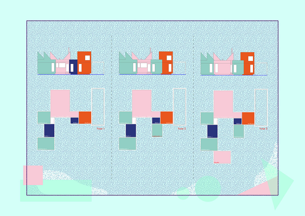 The general idea is for it to develop in phases. This first phase provides a basic architectural configuration that will gradually be adapted by its inhabitants. The second phase will entail completing the installation of solar panels, the chimney, and starting to plant greenery and small home vegetable gardens. The third phase is for enlarging the home with new models, thereby completing the central courtyard. The modular organization, the scale of the spaces, and the projected connections between modules can all be used to change the functional logic and act as a support for future enlargements and typological refits.