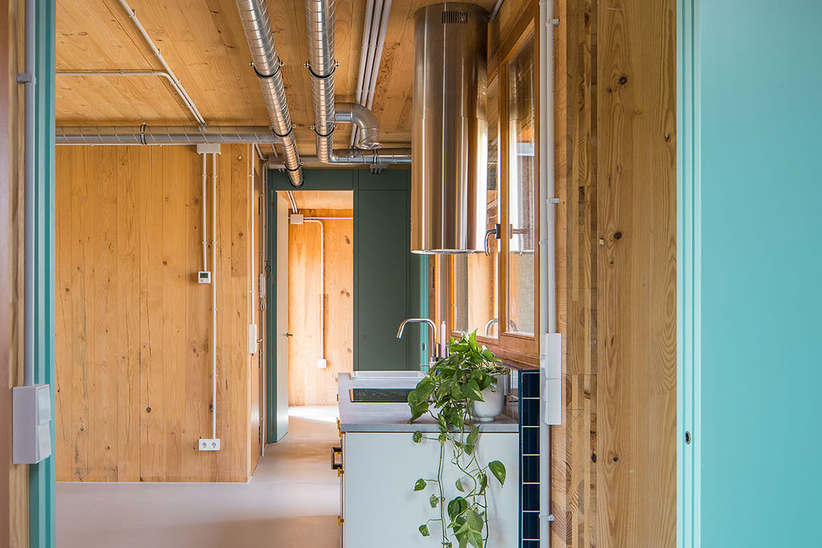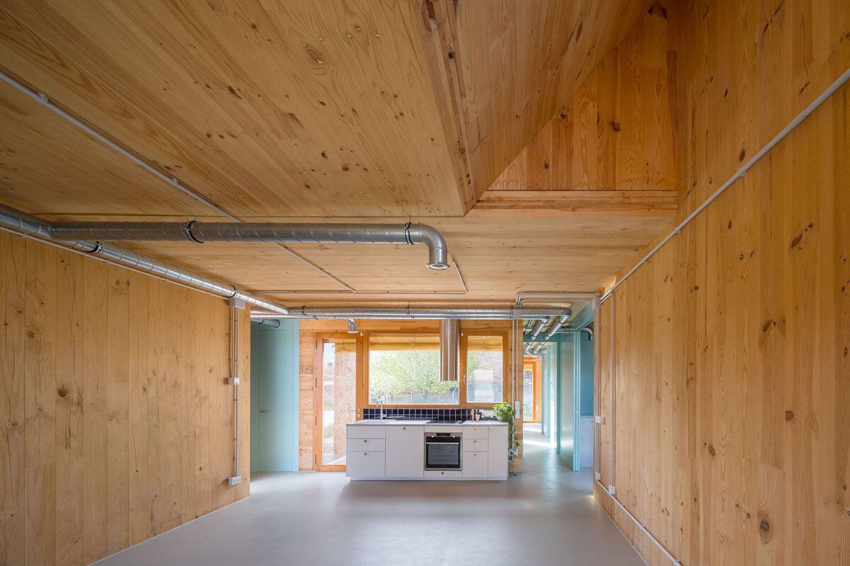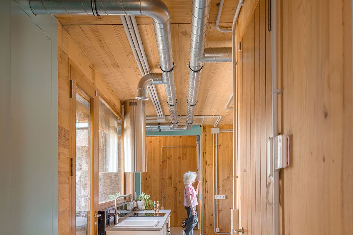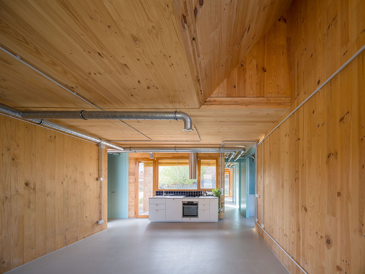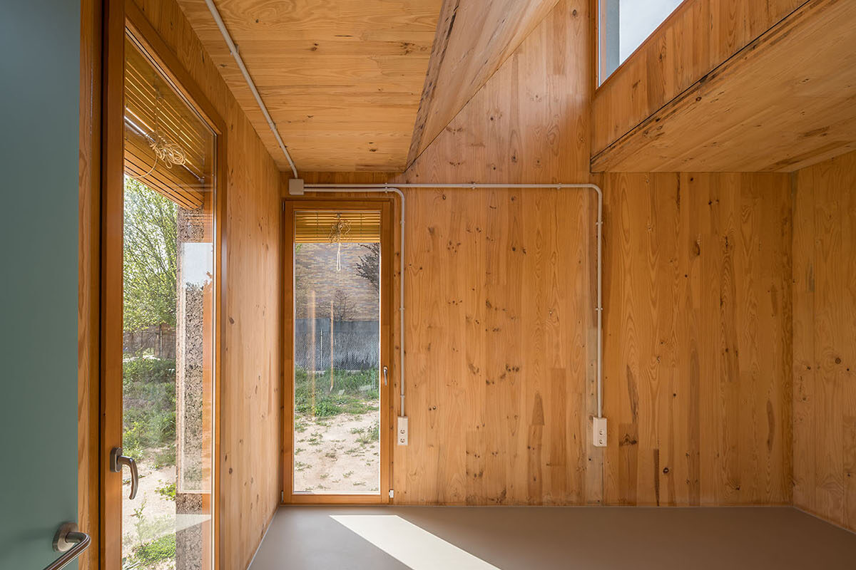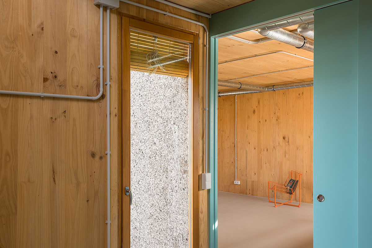 Most of the joinery is done using dry construction, which will allow many of the components to be removed and recycled, facilitating the possibility of taking part in the future of a circular construction. In order to reduce the ecological impact, the number of layers of facing is kept to a minimum, leaving the cross-laminated structural timber and the utility networks in plain sight. This limited use of material is heralded as an opportunity to explore other aesthetics without sacrificing the affective dimension of the indoor and outdoor spaces.