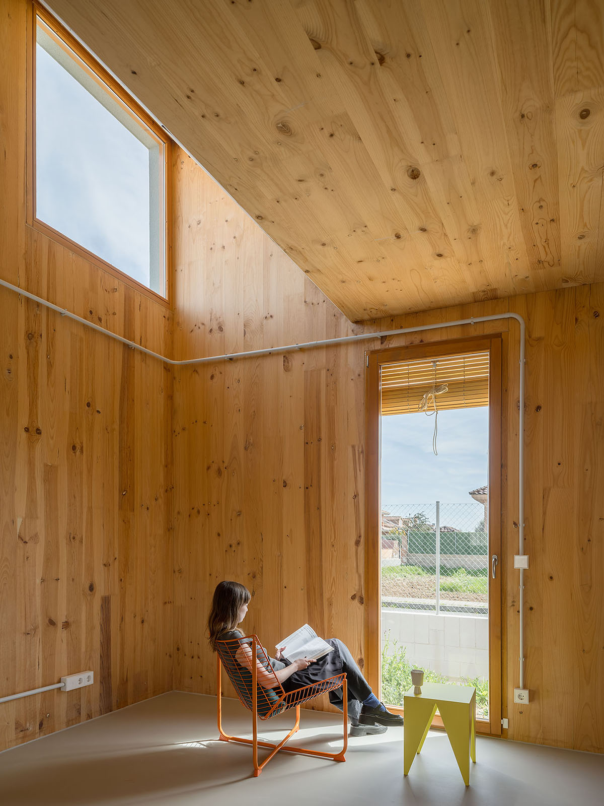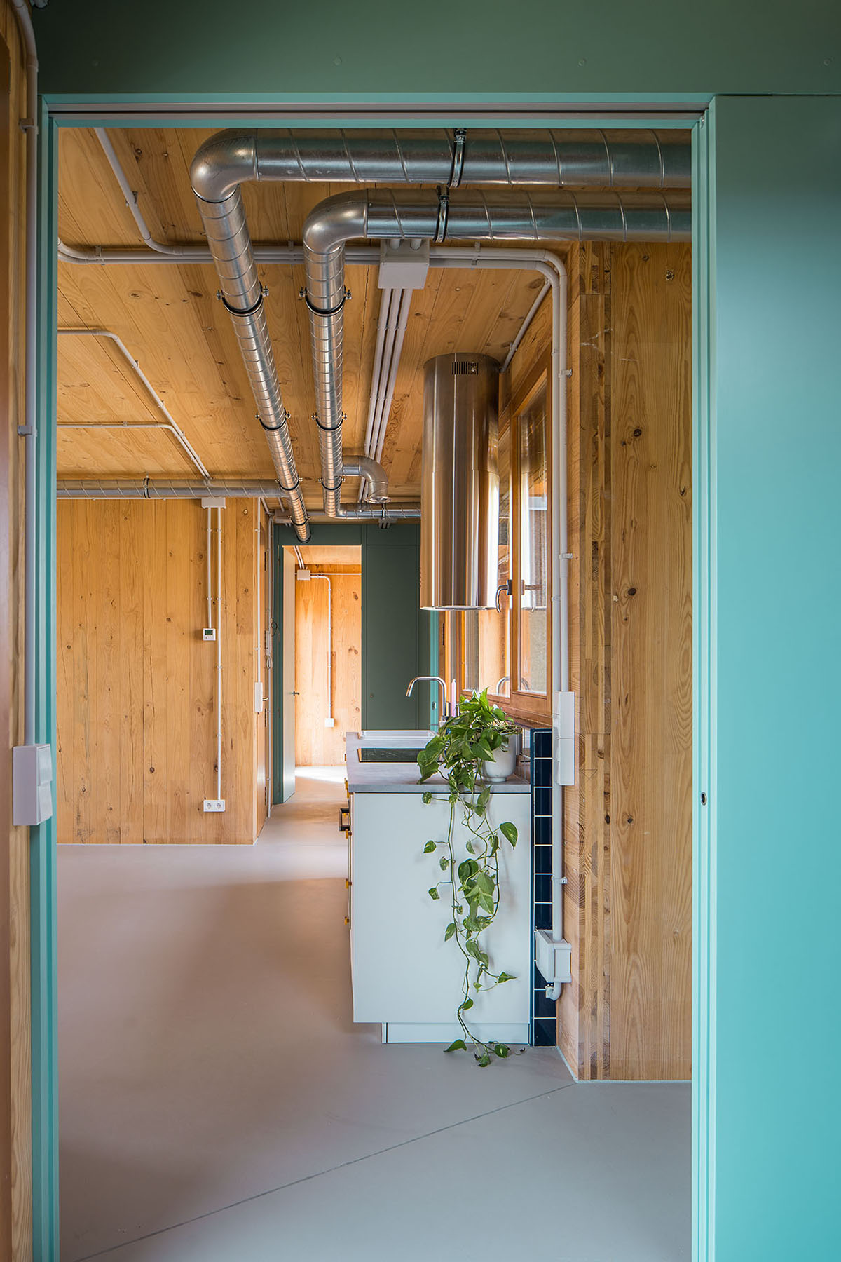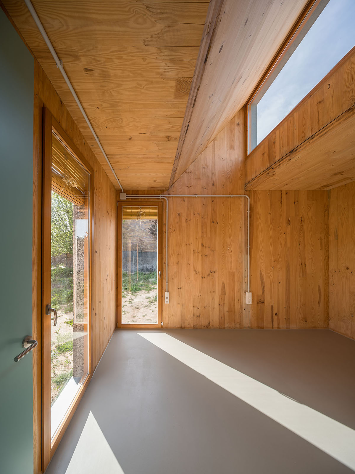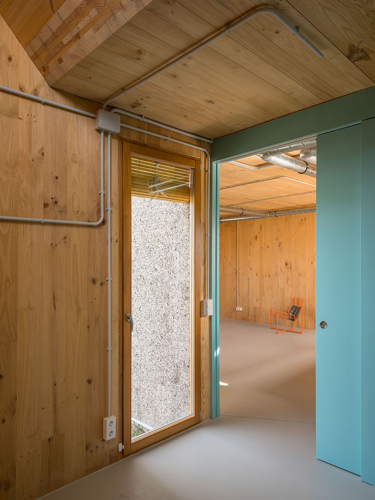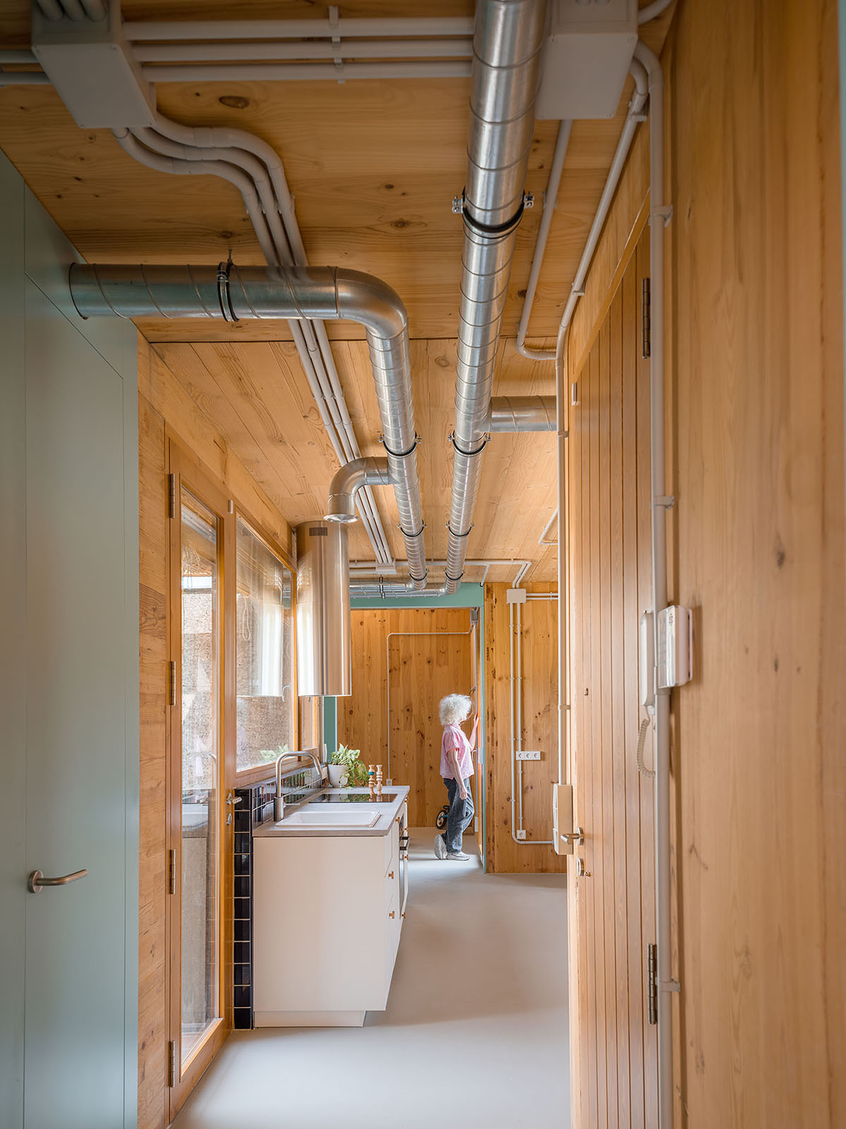 Most of the joinery is done using dry construction, which will allow many of the components to be removed and recycled, facilitating the possibility of taking part in the future of a circular construction. In order to reduce the ecological impact, the number of layers of facing is kept to a minimum, leaving the cross-laminated structural timber and the utility networks in plain sight. This limited use of material is heralded as an opportunity to explore other aesthetics without sacrificing the affective dimension of the indoor and outdoor spaces.
