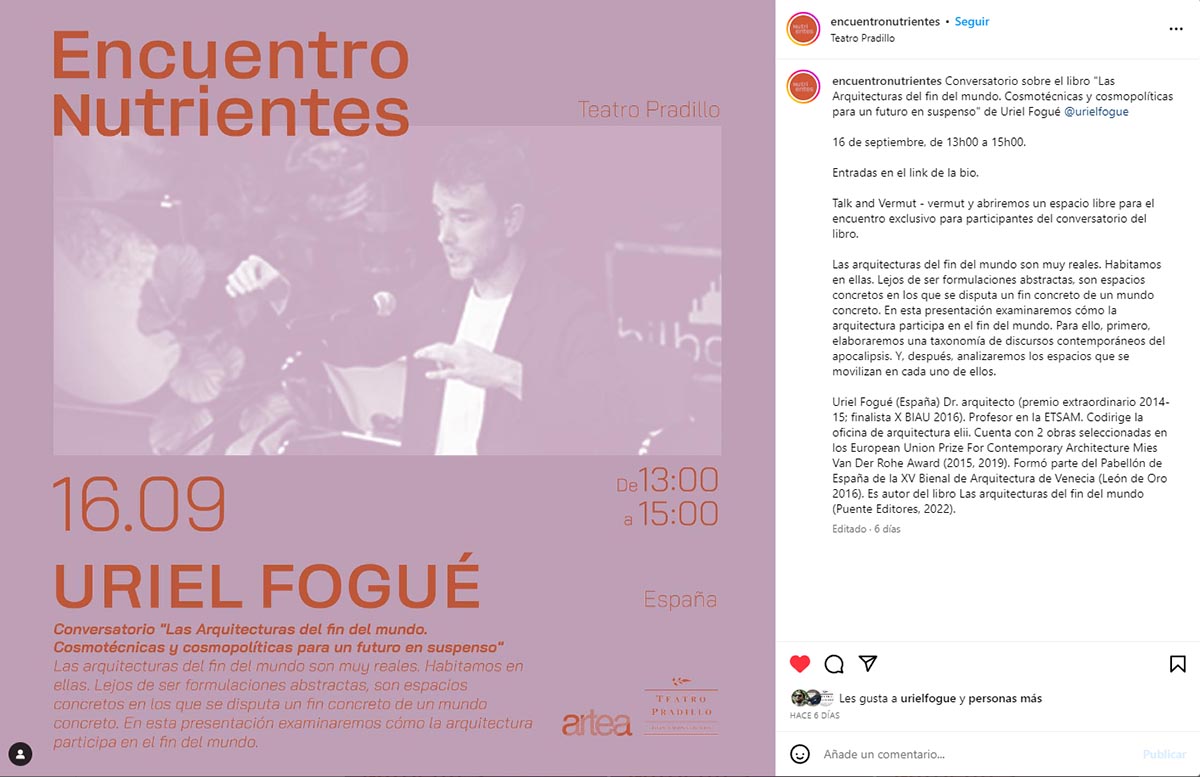 Uriel Fogué will participate in the Nutrientes meeting organized by the group of researchers and artists graduated from the Master in Performing Arts Practice and Visual Culture, with the curatorial support of ARTEA and the technical and communication support of the TEATRO PRADILLO team. Uriel Fogué's lecture will be entitled "Architectures for the end of the world". Saturday September 16th, Theater Pradillo.