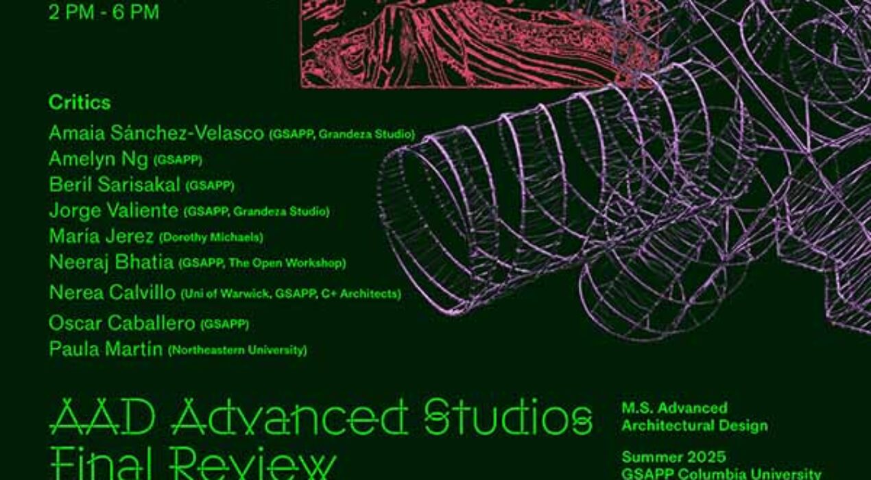 El próximo martes 29 de julio tendrá lugar el Final Review de nuestro estudio "Apocalypse Ectasy. Cosmotechnics and Ecologies of Desire", del Máster AAD Advanced Architectural Design, GSAPP Columbia University. Contaremos con los siguientes invitados: Neeraj Bhatia (Columbia University, The Open Workshop), Oscar Caballero (Columbia University), Nerea Calivillo (University of Warwick, Columbia University, C+ Architects), María Jerez (Dorothy Michaels), Amelyn NG (Columbia University), Paula Martín (Northeastern University), Beril Sarisakal (Columbia University), Amaia Sánchez-Velasco & Jorge Valiente (Columbia University, Grandeza Studio) A las 2:00PM, 600 Ware Lounge. + info: https://www.arch.columbia.edu/reviews + + + Next Tuesday, July 29 will be the Final Review of our studio "Apocalypse Ectasy. Cosmotechnics and Ecologies of Desire", from the Master AAD Advanced Architectural Design, GSAPP Columbia University. We will be featuring the following guests: Neeraj Bhatia (Columbia University, The Open Workshop), Oscar Caballero (Columbia University), Nerea Calivillo (University of Warwick, Columbia University, C+ Architects), María Jerez (Dorothy Michaels), Amelyn NG (Columbia University), Paula Martín (Northeastern University), Beril Sarisakal (Columbia University), Amaia Sánchez-Velasco & Jorge Valiente (Columbia University, Grandeza Studio) At 2:00PM, 600 Ware Lounge. + info: https://www.arch.columbia.edu/reviews